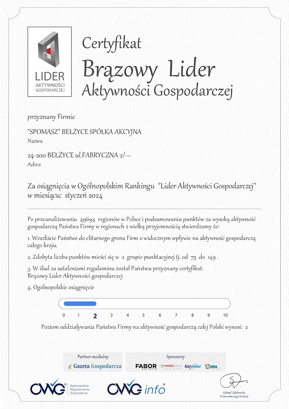 BRĄZOWEGO Lidera Aktywności Gospodarczej za miesiąc styczeń 2024